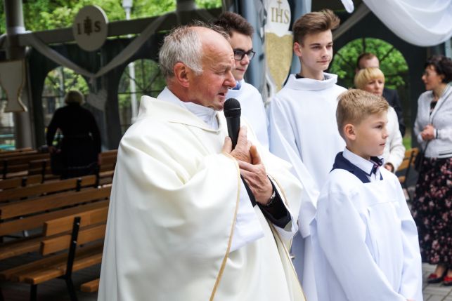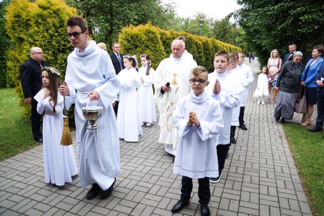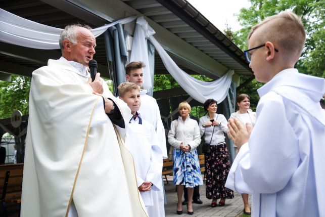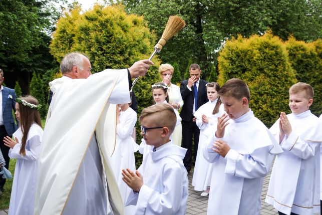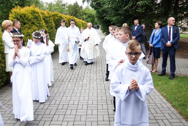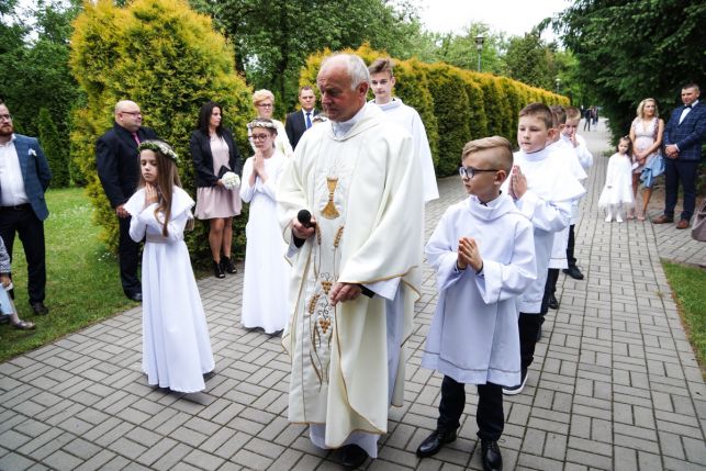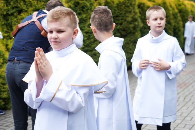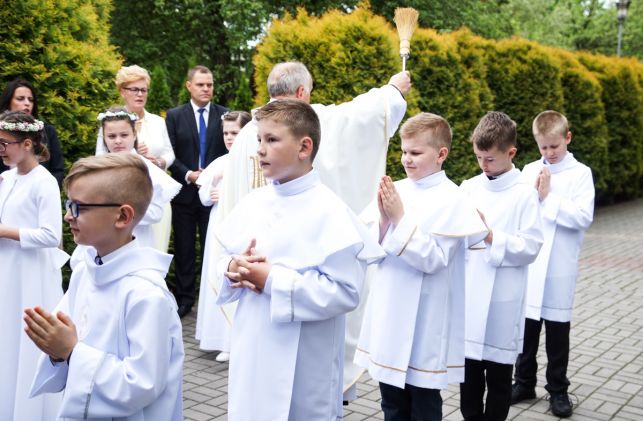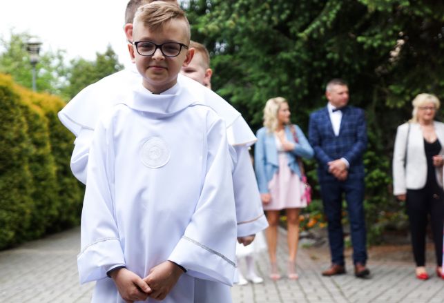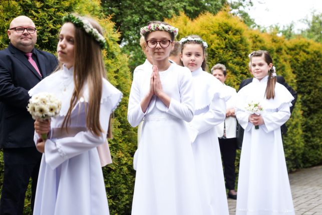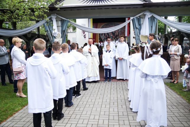 Pierwsza komunia w czasach epidemii. Uroczystości w ogrodach parafialnych przy ul. Kościuszki [FOTO]