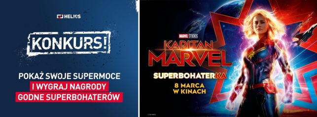 Zaprezentuj na zdjęciu swoje supermocne, a następnie wyślij je wraz z danymi na adres: kapitanmarvel@helios.pl Na zwycięzcę czeka pakiet niezapomnianych nagród-wrażeń: lot balonem (ze szkoleniem), pierwszy kurs pilotażu, skok ze spadochronem z filmowaniem selfie oraz zestaw unikalnych gadżetów z filmu. Dla kolejnych 5 osób czekają zestawy filmowych upominków*.
