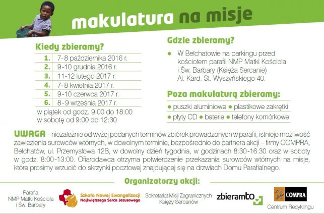 Każdy kto chce wesprzeć akcję może dziś (w godz. 9.00 – 18.00) i jutro (w godz. 9.00 – 12.30) przynieść zbędne surowce na parking parafii. Jak informują organizatorzy poza cyklicznie zorganizowanymi zbiórkami, których harmonogram zamieszczony jest na poniższym plakacie surowce można oddawać non stop w siedzibie firmy Compra