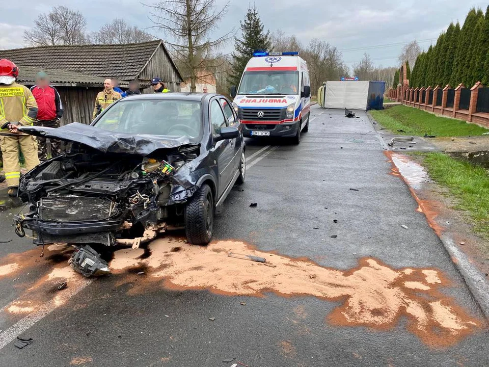 Groźne zderzenie samochodów pod Ruścem. Ciężarówka przewróciła się na bok [FOTO]