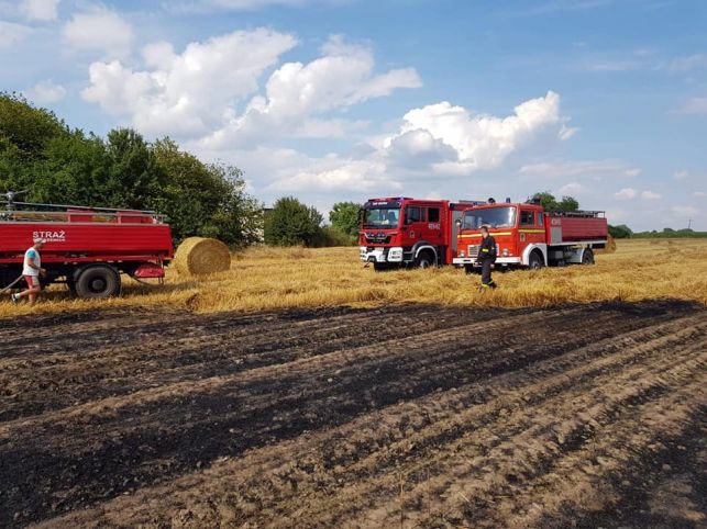 Pożar miał miejsce na uprawie rolnej, na której stała prasa firmy John Deere do zbierania słomy. Maszyna zapaliła się na skutek nadmiernego tarcia w łożysku, a łatwopalna słoma szybko zajęła się ogniem. Strażacy walczyli z żywiołem zabezpieczając oraz wylewając jeden prąd wody na palącą się słomę, która paliła się na w sumie 10 arach. Właściciel oszacował straty na około 26 tys. zł.