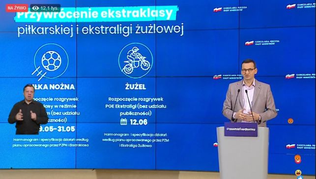 Premier Mateusz Morawiecki podjął decyzję o powrocie ekstraklasy piłkarskiej i żużlowej. Piłkarze mają wznowić rozgrywki w terminie 29-31 maja, a już z początkiem maja powrócą do treningów. Start niższych lig zależny jest od decyzji PZPN-u. Żużlowcy natomiast rozpoczną zmagania 12 czerwca. Wszystkie zawody będą póki co odbywać się bez udziału publiczności.