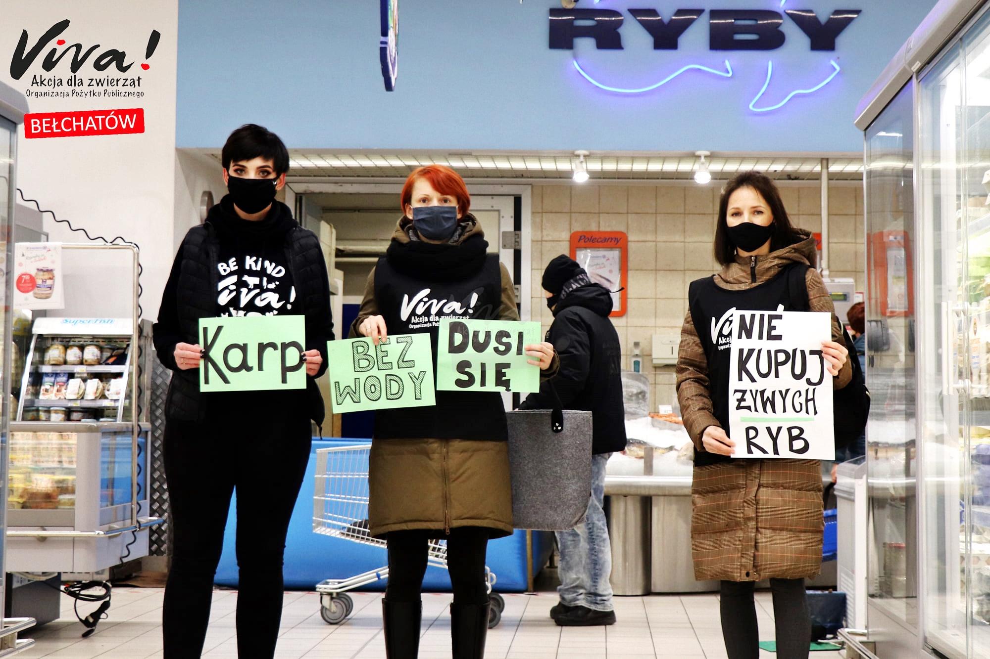 „Karp bez wody dusi się” czy „Nie kupuj żywych ryb” - z takimi hasłami na terenie jednego z bełchatowskich marketów pojawili się członkowie organizacji Viva Akcja dla Zwierząt. Rozdawali mieszkańcom Bełchatowa ulotki i namawiali, aby na święta nie kupować żywego karpia.