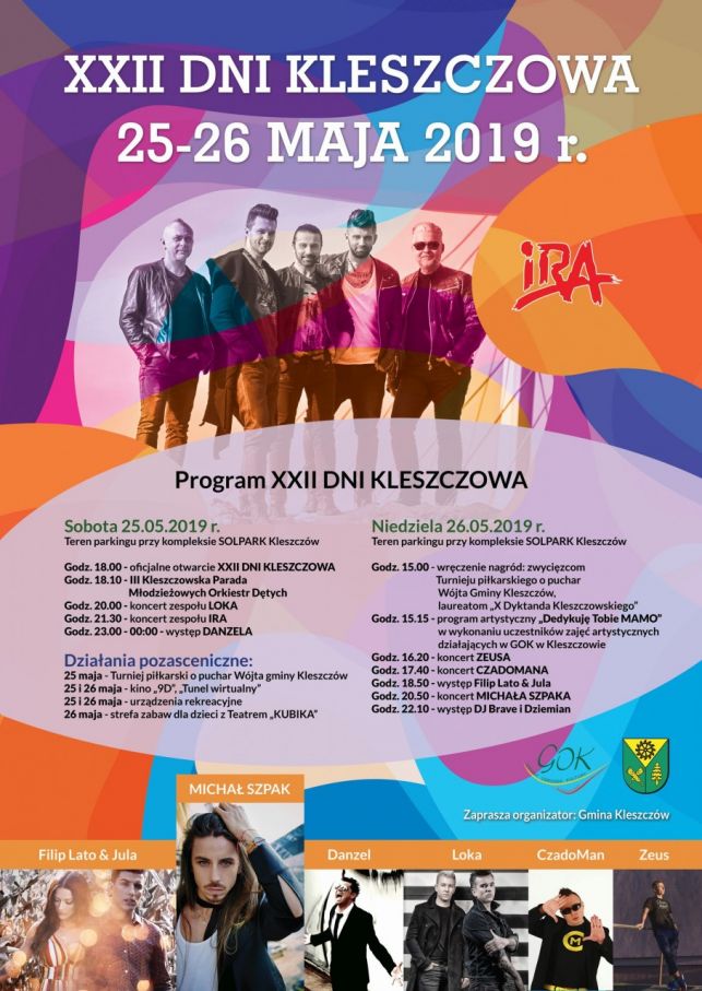 25 maja, w sobotę koncertową część programu otworzy III Kleszczowska Parada Młodzieżowych Orkiestr Dętych. Tego dnia miłośnicy koncertów muzycznych mogą liczyć jeszcze na występy zespołów LOKA oraz legendy polskiego rocka - zespołu IRA. Imprezę zakończy energetyczny Belg - Danzel.