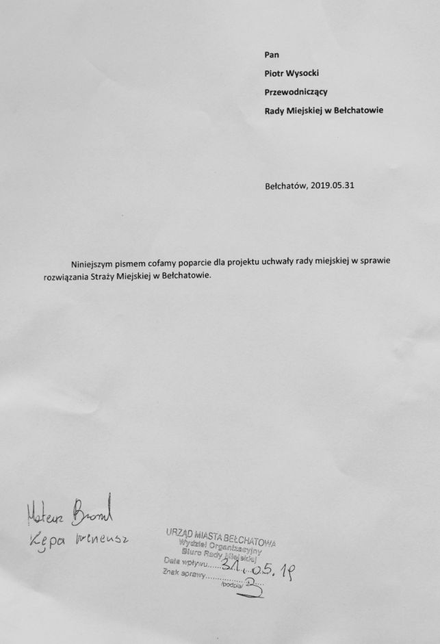 „Niniejszym pismem cofamy poparcie dla projektu uchwały rady miejskiej w sprawie rozwiązania Straży Miejskiej w Bełchatowie”