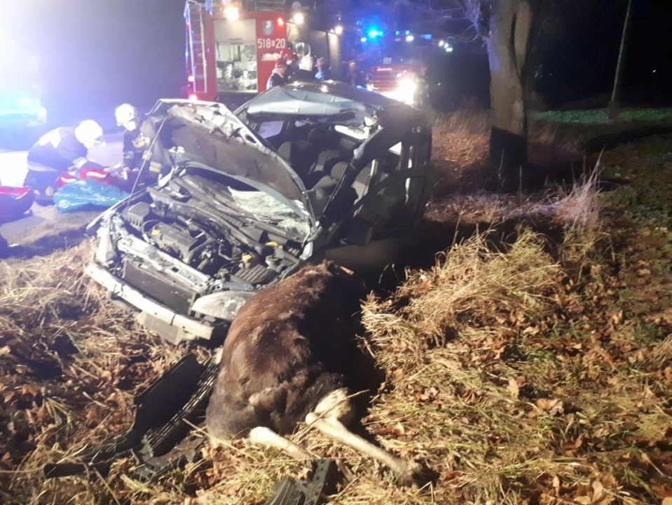 Łosie w Polsce mogą ważyć nawet ponad 700 kilogramów, nic więc dziwnego, że samochód po spotkaniu z takim zwierzęciem był zupełnie zniszczony. Kierowca wraz z 55-letnim pasażerem doznali urazów rąk i głowy, zostali przewiezieni do szpitala.
