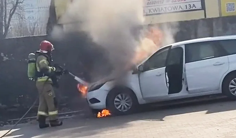 W środę 16 marca, około godziny 12:20 na ul. Kwiatowej zaparkowany przy drodze ford focus stanął w płomieniach. Ogień zaczął buchać spod maski pojazdu, a dookoła pojawiły się kłęby dymu. Przypadkowi przechodnie widząc, co się dzieje natychmiast zadzwonili po pomoc. Na miejscu pierwsi pojawili się policjanci. Mając do dyspozycji dwie nieduże gaśnice, zaczęli w miarę możliwości dusić płomień. Chwilę później dojechał wóz strażacki. Przy pomocy piany gaśniczej udało się finalnie opanować pożar. Auto uległo jednak dość poważnemu zniszczeniu. Szczęśliwie nikt w zaistniałej sytuacji nie ucierpiał.
