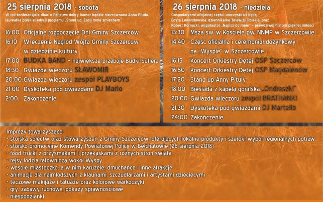 W niedzielę natomiast, gmina Szczerców będzie świętować dożynki. Z tej okazji 26 sierpnia zagra zespół Brathanki stawiający na unikalne połączenie popu, folku, rocka oraz funku. Poza tym oryginalnym, polskim zespołem, wystąpi także kapela Ondraszki, która jest przedstawicielem muzyki oraz kultury góralskiej. Na koniec, imprezę poprowadzi Dj Martello.