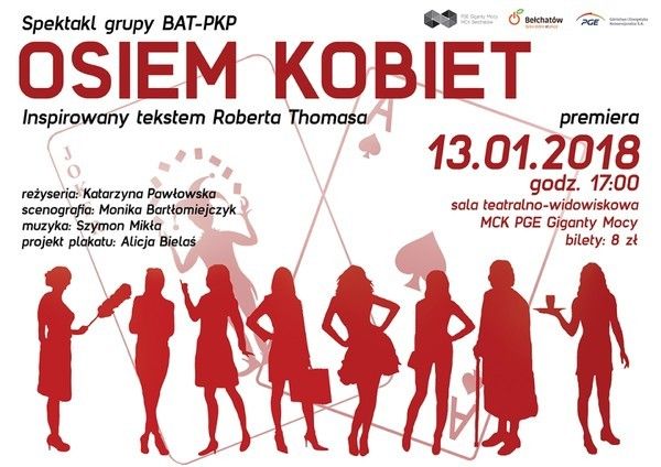 Zapraszamy na premierowy spektakl grupy BAT – PKP, pt. „Osiem kobiet”. Sztuka, inspirowana tekstem Roberta Thomasa, zostanie zaprezentowana 13 stycznia o godzinie 17:00, w sali teatralno – widowiskowej MCK PGE Giganty Mocy.