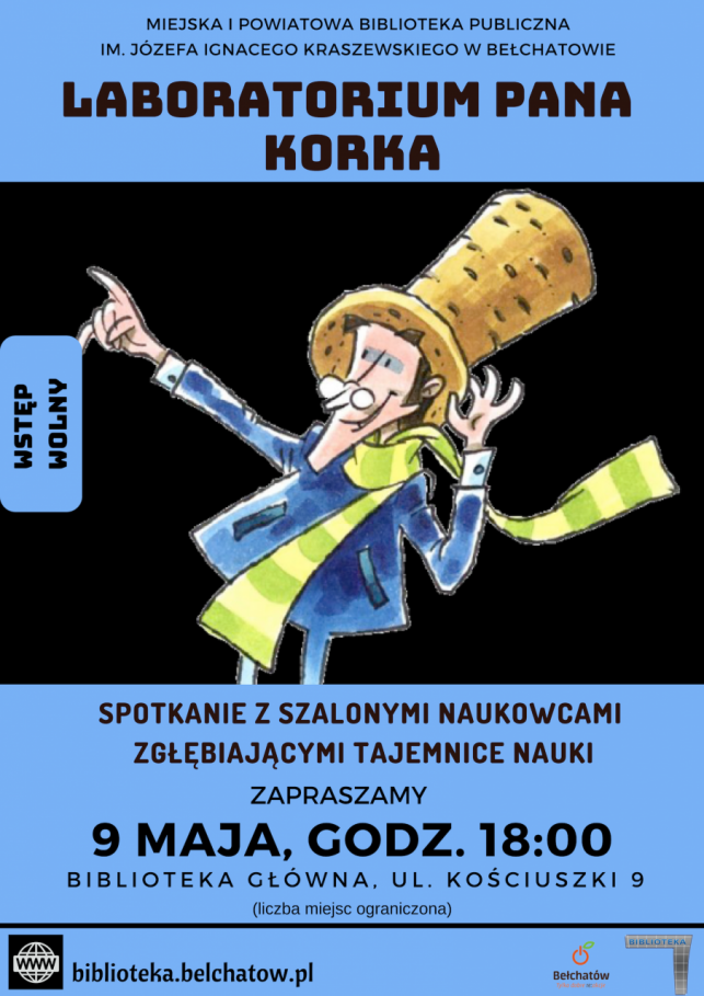 Laboratorium Pana Korka – Pan Korek to sympatyczny jegomość w korkowym kapeluszu, który od pięciu lat podróżuje po świecie przybliżając piękno nauki na odlotowych pokazach i pasjonujących warsztatach w przedszkolach, szkołach, itp., a 9 maja 2019 r. o godzinie 18:00 zawita do biblioteki głównej przy ul. Kościuszki 9.
