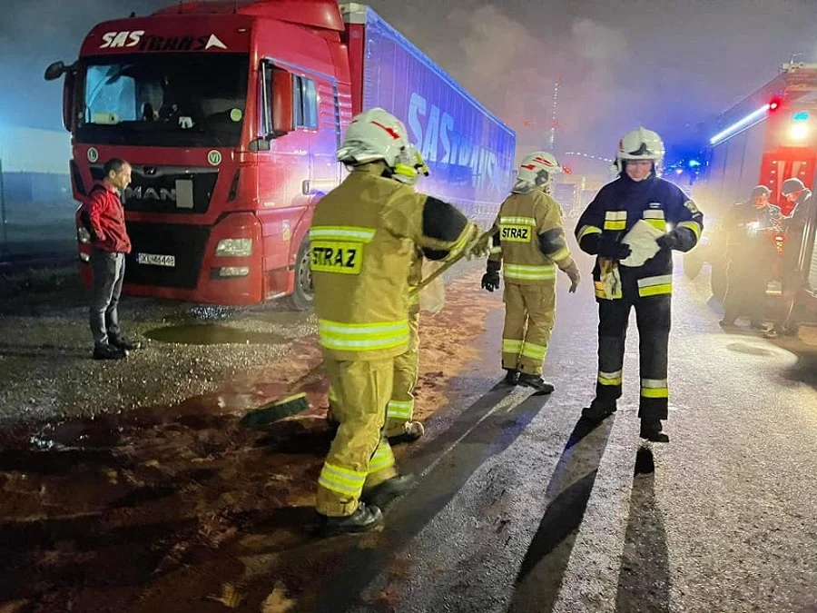 - Zostaliśmy zadysponowani do zabezpieczenia plamy substancji wyciekającej z rozszczelnionego zbiornika samochodu ciężarowego - informuje OSP Łękawa.