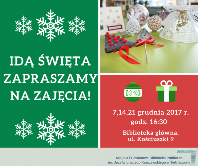 Zapraszamy młodzież oraz dzieci z rodzicami lub dziadkami do biblioteki głównej (ul. Kościuszki 9) na zajęcia plastyczno-manualne pt. Święta łączą pokolenia. Podczas warsztatów uczestnicy będą mogli wykonać przeróżne ozdoby świąteczne. Zajęcia odbędą się w dniach: 7,14 i 21 grudnia br. o godzinie 16:30. Wstęp wolny.