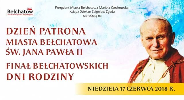 Dzień Patrona rozpocznie się o 11:45 pod pomnikiem św. Jana Pawła II, gdzie mieszkańcy złożą kwiaty i przejdą do pobliskiej parafii. Tam, o 12:00 odprawiana będzie msza święta, którą poprowadzi ks. abp Władysław Ziółek. O 15:00 z placu Narutowicza wyruszy "Marsz dla Życia i rodziny", który przejdzie ulicami Lecha i Marii Kaczyńskich, Kwiatową, 1 Maja oraz Kościuszki. Pochód zakończy się o 15:30 festynem pn. "Rodzina z patronem Miasta Bełchatowa" w ogrodach parafii pw. Narodzenia NMP. Wydarzeniu będą towarzyszyć konkursy, zabawy plastyczne, loterie fantowe i występy zespołów, wśród nich na scenie zaprezentują się laureaci festiwalu piosenki papieskiej i religijnej "Santo Subito". Na zakończenie pikniku o 18:30 wystąpi grupa muzyczna z Łodzi "Mały Chór Wielkich Serc", który liczy sobie około pięćdziesięcioro dzieci.