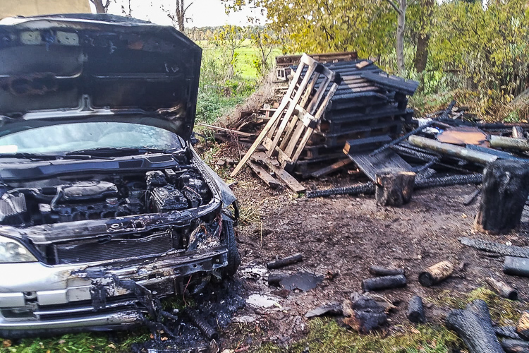 Rozprzestrzeniający się ogień całkowicie strawił budynek, znacznemu uszkodzeniu uległ również samochód osobowy marki Opel stojący tuż obok.