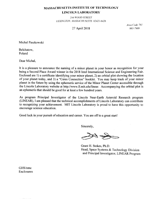Kilka tygodni temu do Bełchatowa dotarła korespondencja od dr Granta H. Stokes'a z Massachusetts Institute of Technology o tym, że asteroida o numerze 34525 otrzymała patrona w osobie Michała Paszkowskiego.