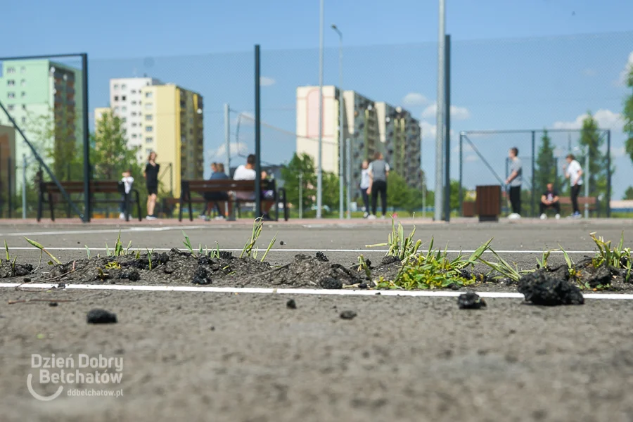 Odwiedziliśmy boiska w parku na Dolnośląskim i faktycznie, naszym oczom ukazał się popękany w wielu miejscach asfalt, spod którego faktycznie wyrastają kępki trawy.