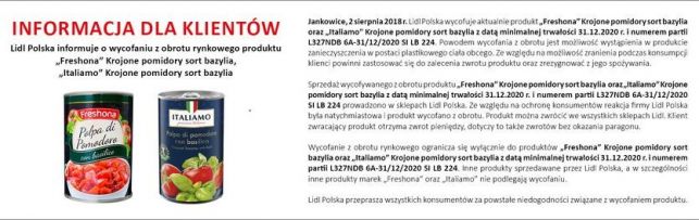 Lidl wycofuje pomidory w puszce dwóch znanych firm - "Freshona" (krojone pomidory sort bazylia) oraz "Italiamo" (krojone pomidory sort bazylia) z datą minimalnej trwałości 31.12.2020 r. i numerem partii L327NDB 6A-31/12/2020 SI LB 224. W puszkach tych wykryto śladowe ilości... plastiku, który może spowodować zranienie się podczas konsumpcji.
