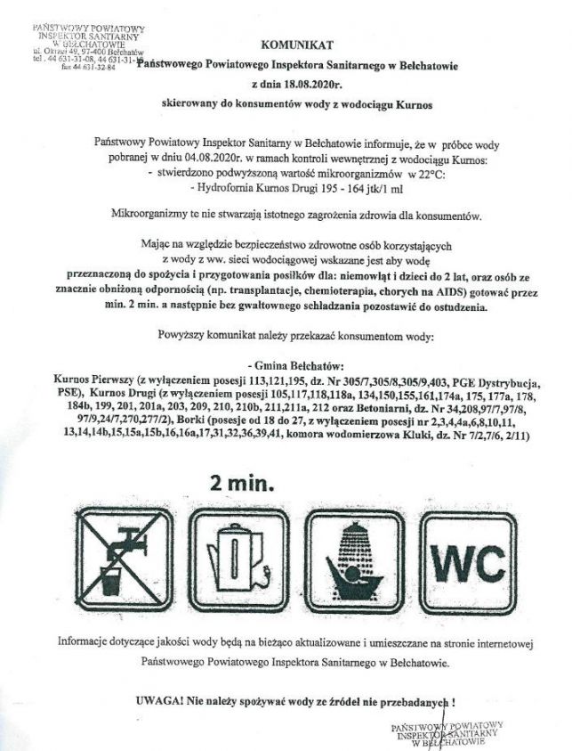 - Mając na względzie bezpieczeństwo zdrowotne osób korzystających z wody z sieci wodociągowej Kurnos, wskazane jest aby wodę przeznaczoną do spożycia i przygotowania posiłków dla: niemowląt i dzieci do 2 lat oraz osób ze znacznie obniżoną odpornością (np. Transplantacje, chemioterapia, chorych na AIDS) gotować przez co najmniej 2 min., a następnie bez gwałtownego schładzania pozostawić do ostudzenia – czytamy w komunikacie.