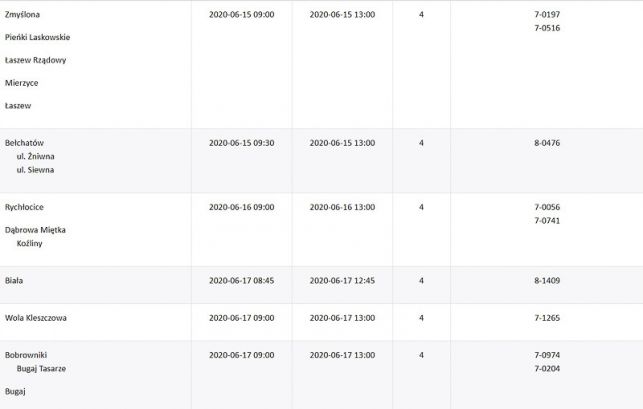 Na przerwy w dostawie prądu muszą przygotować się też mieszkańcy okolicznych miejscowości, m.in. Domiechowic, Bugaju czy Zelowa. Pełną listę wraz z datami i godzinami planowanych wyłączeń znajdziecie w tabelach poniżej.