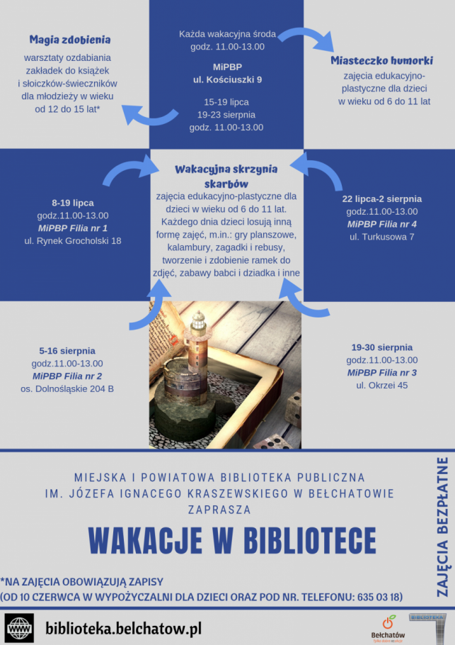 Podczas tegorocznych wakacji biblioteka zaprasza dzieci i młodzież do placówek, które przygotowały bogatą ofertę zajęć. Biblioteka główna, proponuje młodzieży warsztaty z tworzenia i ozdabiania zakładek do książek i słoiczków-świeczników, a dla dzieci przygotowała cykliczne spotkania pt. „Miasteczko humorki”. W filiach na dzieci będzie czekała wakacyjna skrzynia skarbów, z której codziennie będą mogły wylosować tematykę danego spotkania. Szczegółowy harmonogram zajęć wakacyjnych dostępny jest na stronie biblioteki www.biblioteka.belchatow.pl i na profilu Facebookowym .
