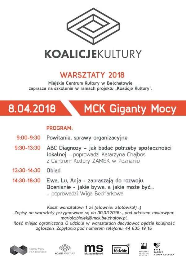 Miejskie Centrum Kultury w Bełchatowie zaprasza na szkolenie w ramach programu „Koalicje Kultury”, realizowanego przez Muzeum Sztuki w Łodzi. Warsztaty w Bełchatowie odbędą się 8 kwietnia. Trwają zapisy.