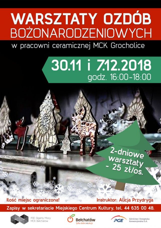 Miejskie Centrum Kultury w Bełchatowie zaprasza do udziału w Warsztatach Ozdób Bożonarodzeniowych, które odbędą się 30 listopada oraz 7 grudnia, w godzinach 16:00 – 18:00, w pracowni ceramicznej MCK Grocholice.