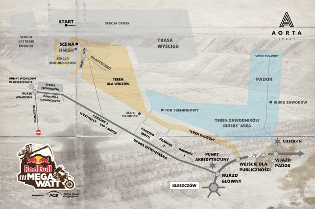Wejście na teren imprezy zlokalizowane jest przy obwodnicy – dojście od ronda wydzielonym chodnikiem (NIE PRZEKRACZAJ OBWODNICY W MIEJSCU NIEDOZWOLONYM). Po przejściu przygotowanym przejściem dla pieszych czeka Cię ok. 15 minut pieszej drogi przez kopalnię, w czasie której na pewno natrafisz na Padok Elity. Tam możesz zobaczyć z bardzo bliska najlepszych zawodników na świecie. Po kolejnych kilku minutach dojdziesz do miasteczka imprezy, gdzie zlokalizowane są stoiska partnerów i wystawców, gastronomia, sklepy z gadżetami i strefy sanitarne. Wreszcie dotrzesz na taras widokowy, z którego rozciąga się panoramiczny widok na tor zawodów, start wyścigu finałowego i atrakcje lotnicze. Na tym poziomie zlokalizowane są również strefy specjalne (VIP, MEDIA). Po zejściu w dół tarasu możesz z bardzo bliska zobaczyć najbardziej spektakularne elementy toru enduro-cross: piekielne rury, szpule, baseny z drewnem, kamienny „ogródek”, a także ogromny podjazd. Największa usypana górka to meta – tam w niedzielę rozegra się finałowa walka.