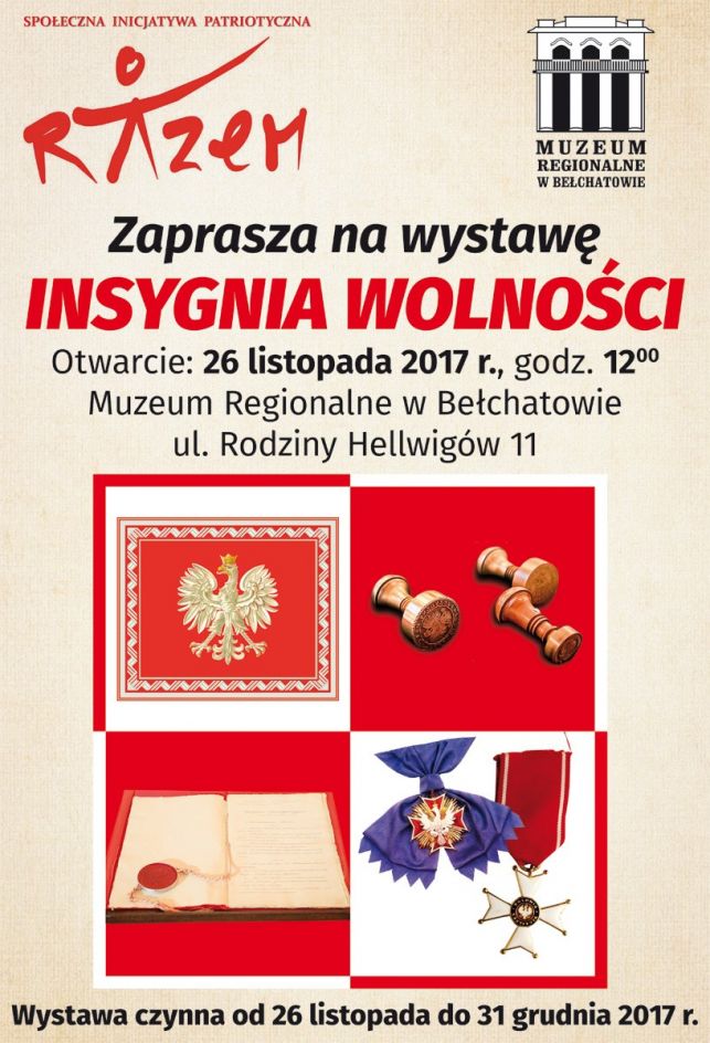 Stowarzyszenie Społeczna Inicjatywa Patriotyczna „RAZEM” w Bełchatowie serdecznie zaprasza na otwarcie wystawy „Insygnia Wolności”, które odbędzie się 26 listopada 2017 roku o godzinie 12:00 w Muzeum Regionalnym w Bełchatowie. Wystawa została zorganizowana w 25. rocznicę przekazania symboli władzy państwowej II Rzeczypospolitej Polskiej Lechowi Wałęsie, pierwszemu po 1989 r. Prezydentowi RP wybranemu w pełni w demokratycznych wyborach. Po zaprzysiężeniu Lecha Wałęsy na Prezydenta RP w dniu 22 grudnia 1990 roku, na Zamku Królewskim w Warszawie odbyła się uroczystość, podczas której ostatni Prezydent RP na uchodźstwie Ryszard Kaczorowski przekazał mu insygnia władzy państwowej II RP, m.in. chorągwie i pieczęcie Prezydenta RP oraz Senatu, oryginał konstytucji kwietniowej, Krzyż Wielki Orderu Orła Białego i Krzyż Wielki Orderu Polonia Restituta. Zgodnie ze słowami Prezydenta Ryszarda Kaczorowskiego - przez długie lata od tragicznego 1939 roku insygnia te były zarówno atutem prawnym władz polskich na emigracji, jak i symbolem wiary w odbudowę umęczonego kraju. Ta podniosła uroczystość stanowiła więc niejako symboliczne nawiązanie ciągłości państwowej z II RP przez nowe niekomunistyczne władze Polski, podkreślenie ciągłości prawnej i ciągłości tradycji oraz był to także symbol odrodzenia się wolnej Polski.
