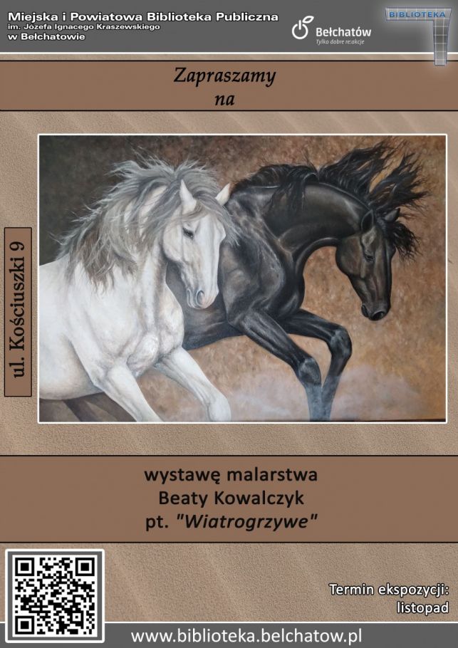W listopadzie w Bibliotece Głównej w Bełchatowie przy ul. Kościuszki 9, będzie można oglądać wystawę malarstwa Beaty Kowalczyk pt. „Wiatrogrzywe”. Autorka prac jest nauczycielką w Szkole Podstawowej nr 13 w Bełchatowie. Maluje od ponad 30 lat, a jej ulubionymi technikami są farby olejne, ołówek, kredki pastelowe i ołówkowe. Motywem przewodnim całej wystawy są konie.