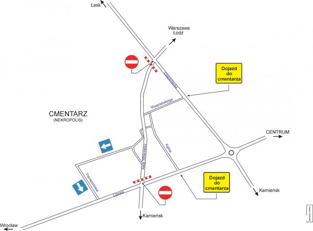 Główne ciągi komunikacyjne, którymi będzie można dojechać i powrócić z cmentarza to ul. Wyspiańskiego i ul. Kątna, na których będzie obowiązywać ruch dwustronny. W obu kierunkach (trasa Warszawa-Wrocław) będzie można się także poruszać ul. Włókniarzy. Dodatkowo wyjazd z cmentarza będzie możliwy ulicami jednokierunkowymi - Transportową i Cmentarną.