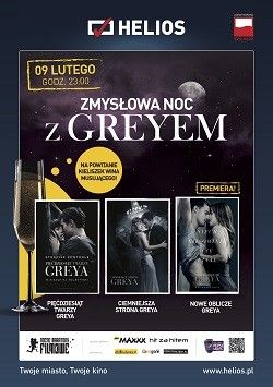 Już 9 lutego, tuż przed Walentynkami kina Helios zapraszają na „ZMYSŁOWĄ NOC Z GREYEM”. Będzie to jedyny, wyjątkowy pokaz trzech części ekranizacji światowego bestselleru - trylogii autorstwa E.L. James. Noc rozpoczniemy „powitalnym drinkiem”*, a potem zagramy kolejno filmy: „PIĘĆDZIESIĄT TWARZY GREYA”, „CIEMNIEJSZA STRONA GREYA” i na koniec premierowo „NOWE OBLICZE GREYA”.