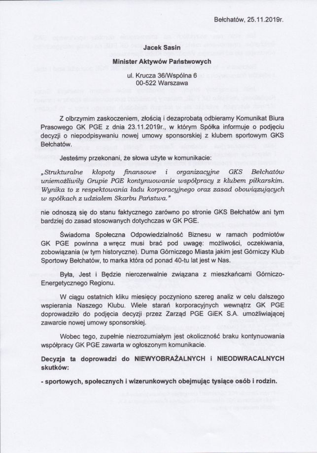 - Bełchatów to stolica Polskiej energetyki. Siła GK PGE pochodzi stąd i stale z efektów finansowych tej siły czerpie – piszą związkowcy w treści apelu i dodają – Jeśli pomagamy innym, to pomóżmy sobie samym wewnątrz Grupy Kapitałowej. Jeśli jako GK PGE, możemy prowadzić sponsorowanie sportu w ramach różnych dyscyplin, sytuując się w różnych częściach naszego kraju, to bądźmy nadal tu, teraz i w przyszłości, na dobre i złe z GKS Bełchatów.